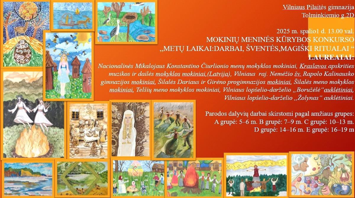 2025 m. spalio 1 d. 13 val. Vilniaus Pilaitės gimnazijoje vyko mokinių meninės kūrybos konkurso „METŲ LAIKAI: DARBAI, ŠVENTĖS, MAGIŠKI RITUALAI“ laureatų parodos atidarymas. Dalyvavo Vilniaus Karoliniškių muzikos mokyklos mokiniai, Vilniaus Pilaitės gimnazijos mokiniai, Vilniaus lopšelio – darželio „Boružėlė“ auklėtiniai.