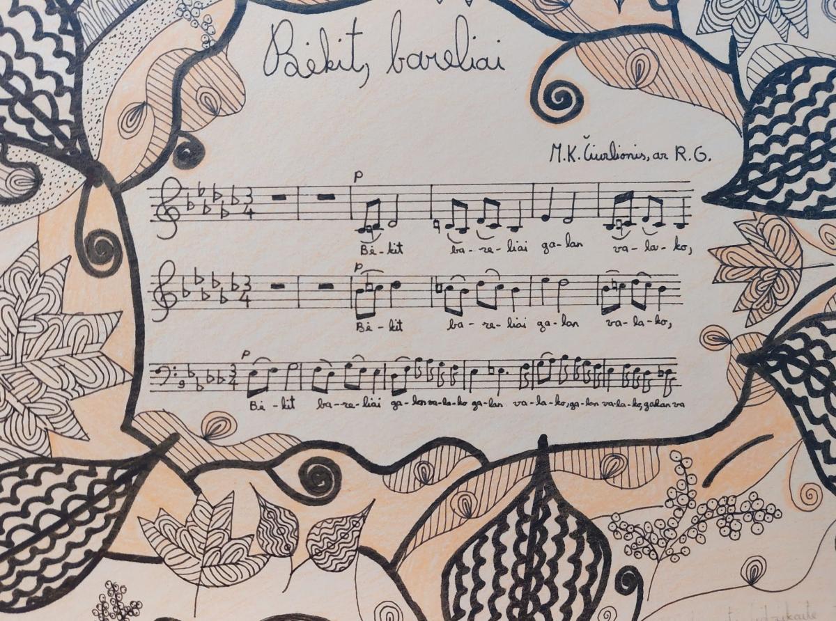 Šiame kūrybiniame projekte gimnazistai kūrė vinjetes, įkvėptas M. K. Čiurlionio dainų motyvų. Įsiklausydami į muzikos nuotaikas, ritmiką ir simboliką, mokiniai siekė vizualiai perteikti garsų pasaulį – tylą, skambesį, vidinį judesį ir emocinę atmosferą grafinėmis priemonėmis.