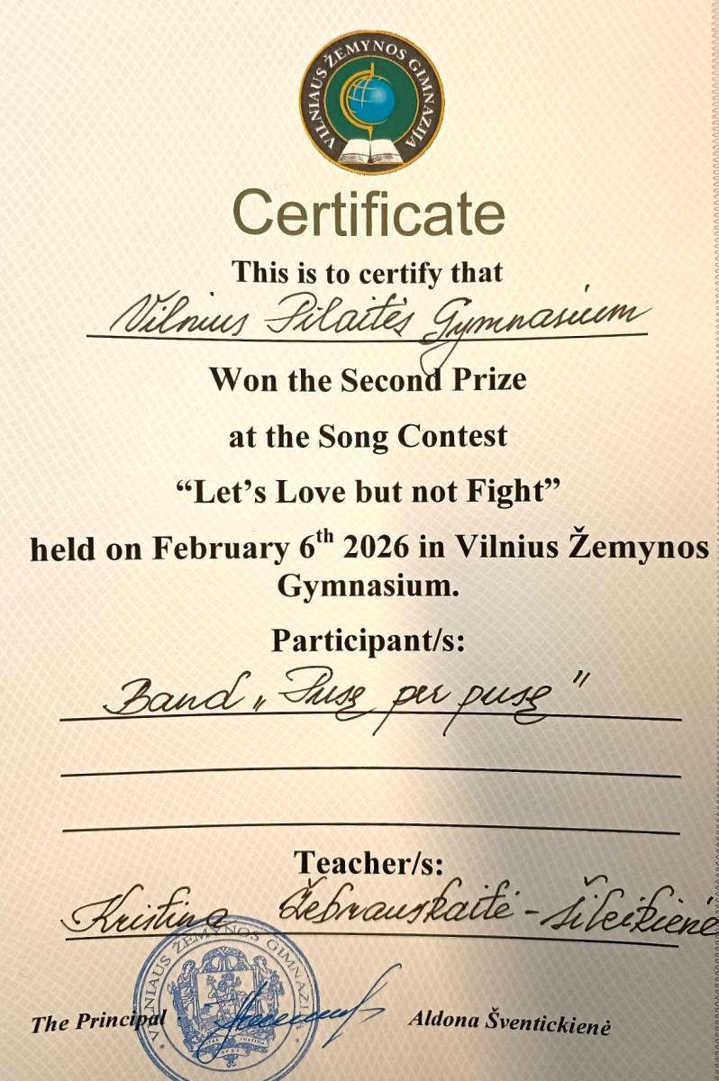 Vasario 6 dieną Pilaitės gimnazijos pirmokų grupė „Pusę per pusę“ dalyvavo angliškos dainos konkurse „Let’s Love but not Fight“ su dainininkės Laufey kūriniu „Valentine“. Muzikantai sulaukė publikos ovacijų, o komisija jiems skyrė 2-ąją vietą. Sveikiname!