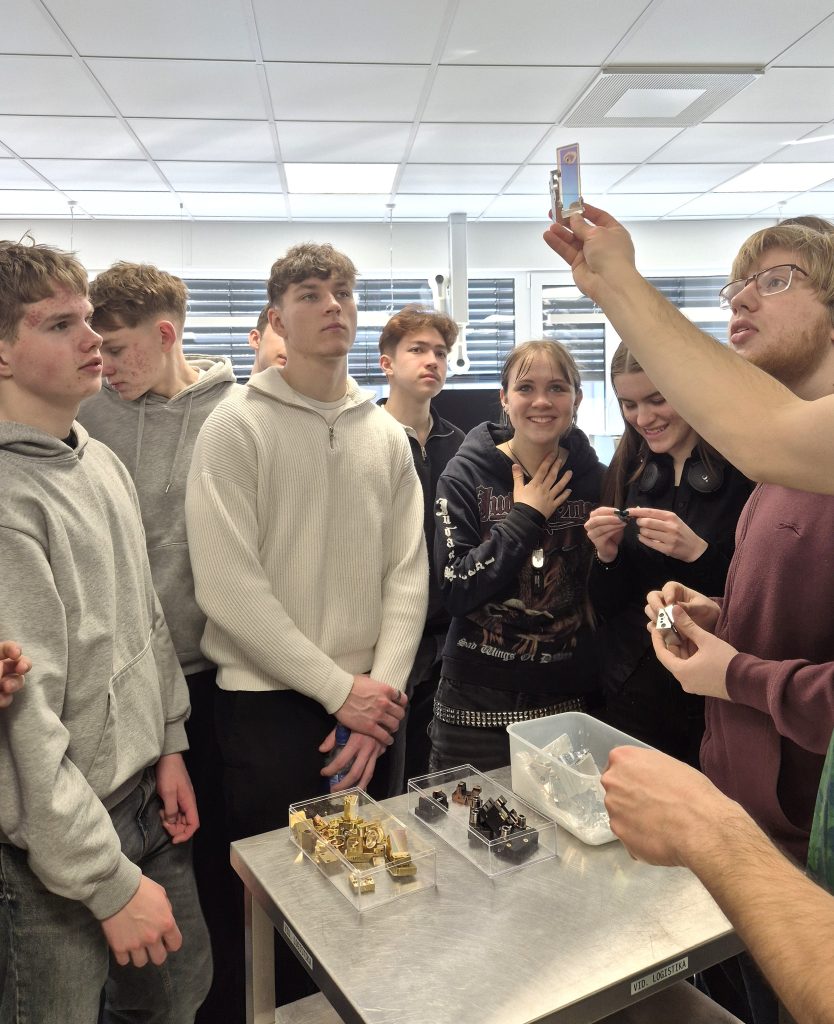 Įmonės atstovas Adomas Kačiušis pristatė lazerio veikimo principą, papasakojo apie lazerių kūrimo ir gamybos procesus bei aprodė gamybines patalpas. Mokiniai sužinojo, kur ir kaip lazeriai naudojami moksle, medicinoje, pramonėje ir kitose srityse.